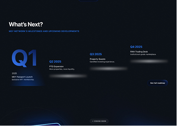 The Mey Network redesign transformed a complex RWA tokenization platform into a clear, trustworthy digital experience. By simplifying the communication of their multi-product ecosystem and streamlining investor journeys, we positioned Mey as a credible leader in the emerging tokenized real estate market. Our deliverables included a complete website redesign, investor portal interface, ecosystem visualization, and a scalable design system ready for future product expansion.