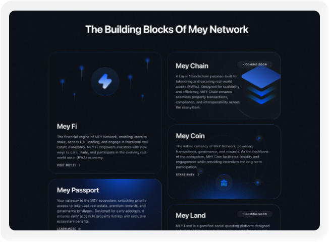 Redesign the landing page to clearly communicate Mey's complex ecosystem—Mey Chain, Mey Coin, Mey Passport, and Mey Land—in an accessible way.